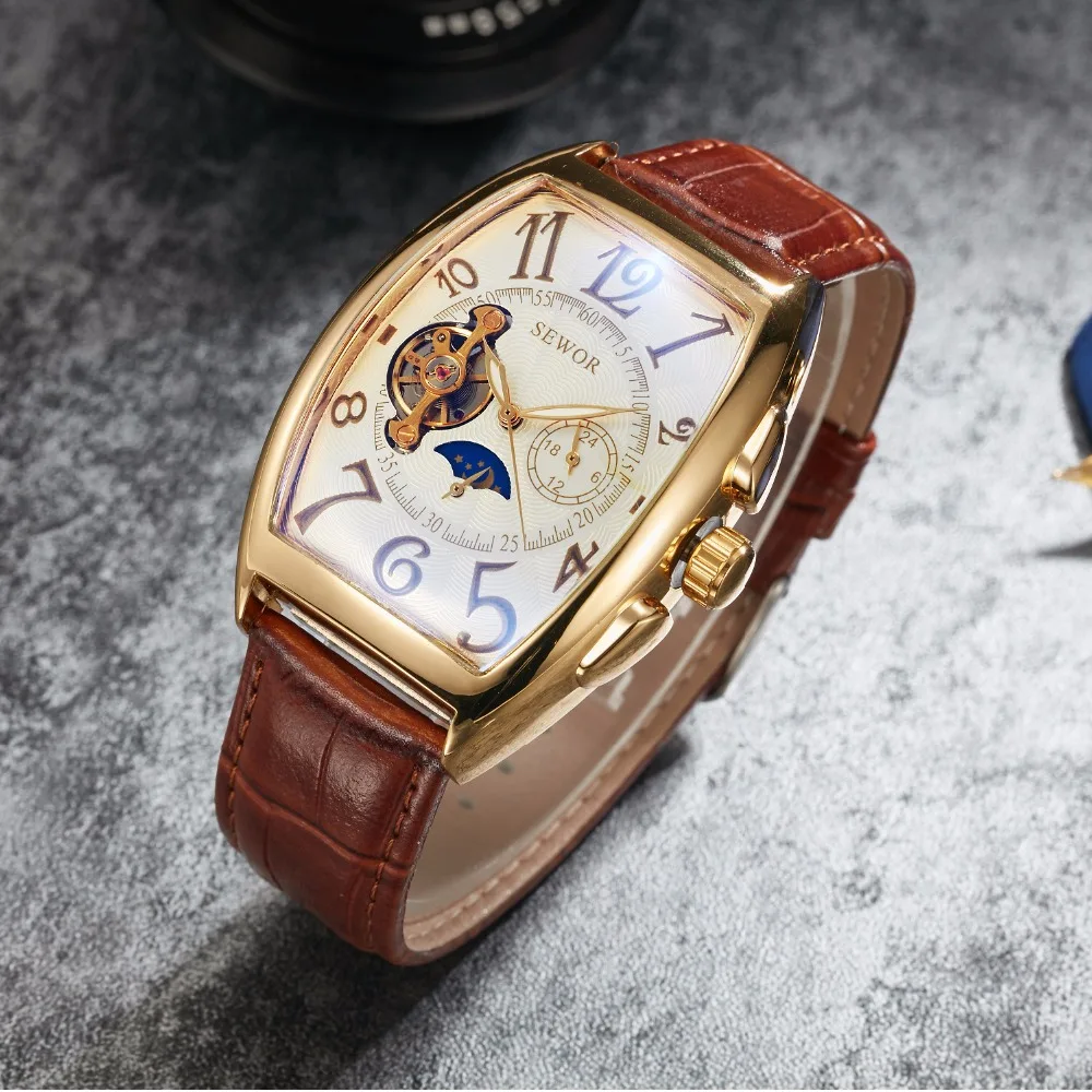 Product Name: SEWOR szkieletowy zegarek mechaniczny automatyczny skórzany pasek z własnym wiatrem faza księżyca mężczyźni luksusowy mężczyzna zegarki z pudełkiem SWQ44