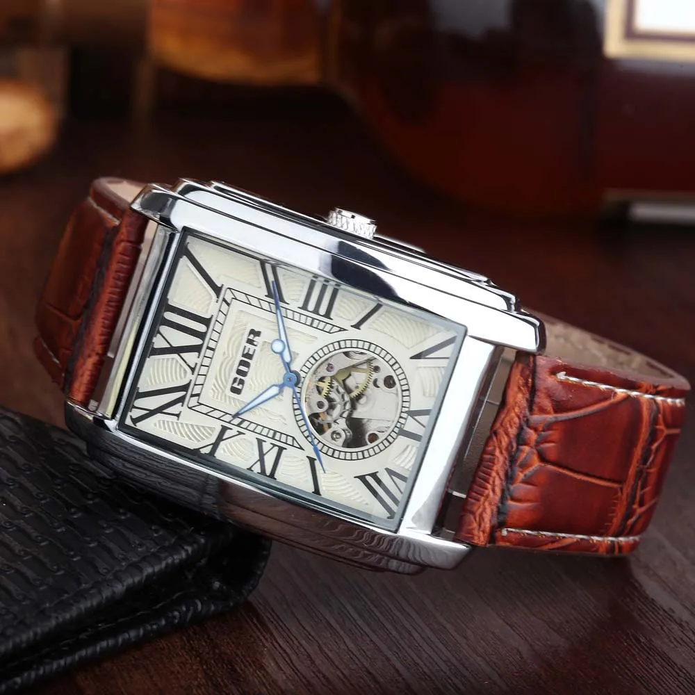 Product Name: Relogio Masculino Top marka luksusowe zegarki szkieletowe mężczyźni skórzany pasek prostokąt automatyczne mechaniczne zegarki na rękę dla mężczyzn GOER