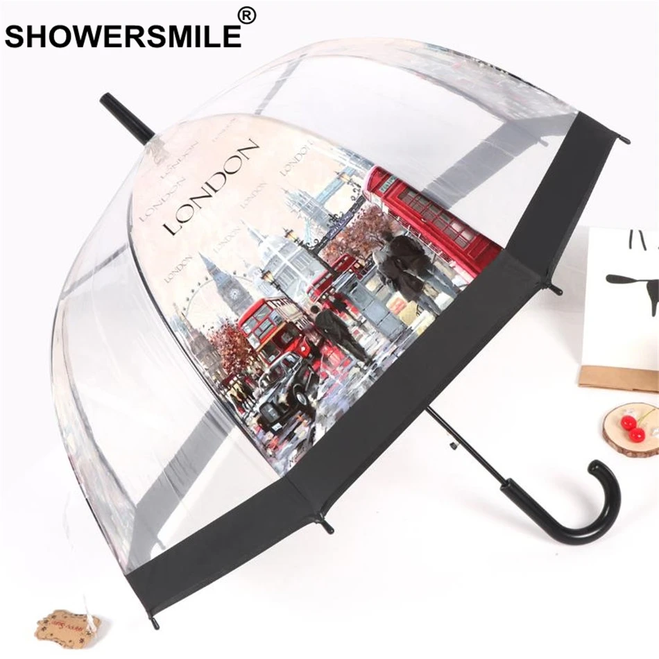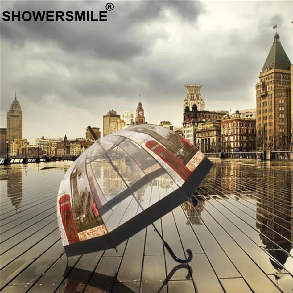 Special Offer SHOWERSMILE przezroczysty parasol automatyczne kobiety klatka parasole długi uchwyt brytyjski londyn budynek panie Apollo parasol przeciwdeszczowy Discount 61% Today!