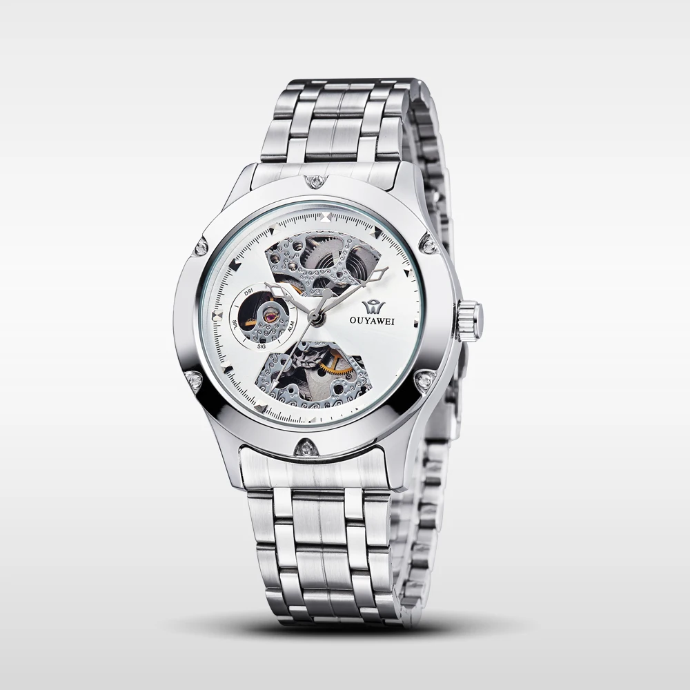 Product Name: Moda retro Design szkielet Sport mechaniczny zegarek męski okrągły stal nierdzewna srebrny pasek biała tarcza srebrna ramka mężczyzn zegarki