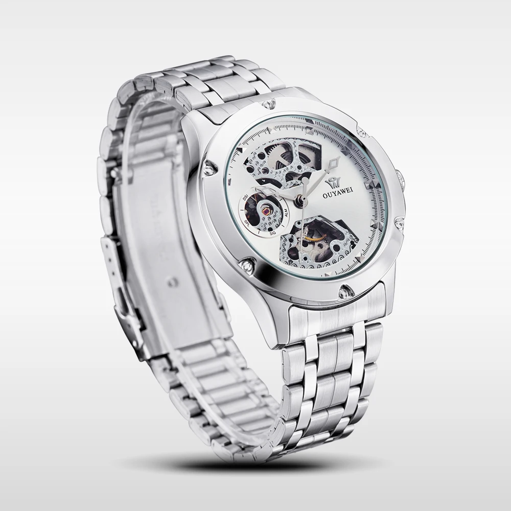 Special Offer Moda retro Design szkielet Sport mechaniczny zegarek męski okrągły stal nierdzewna srebrny pasek biała tarcza srebrna ramka mężczyzn zegarki Discount 26% Today!
