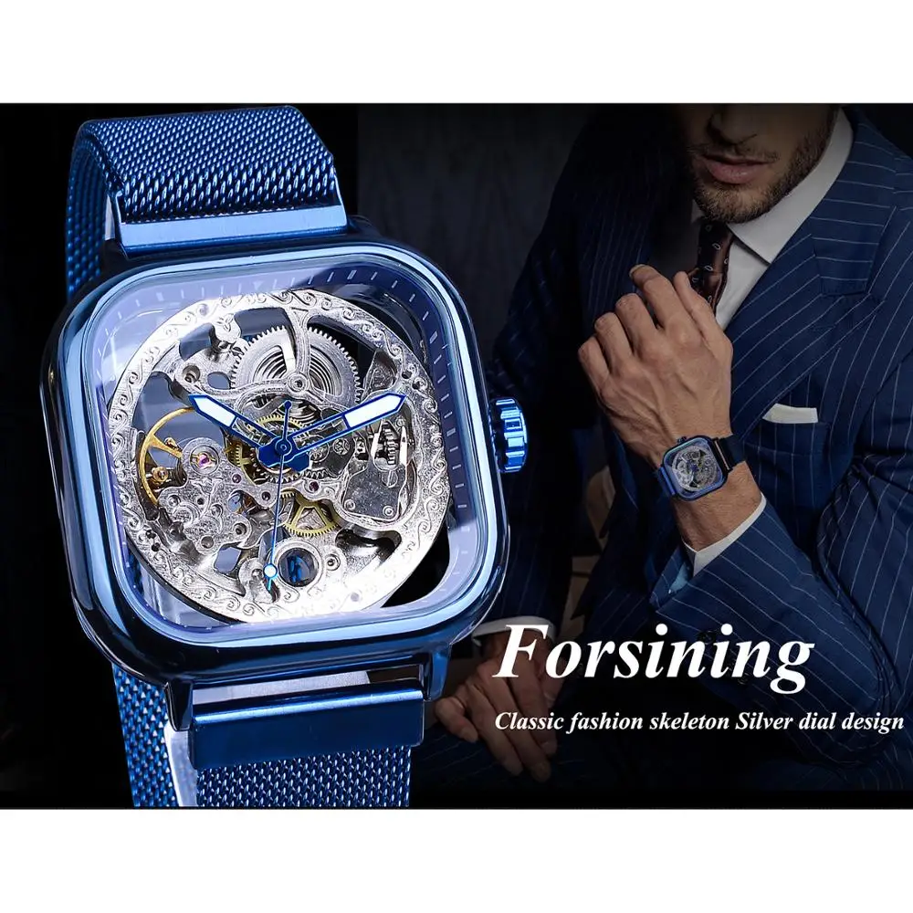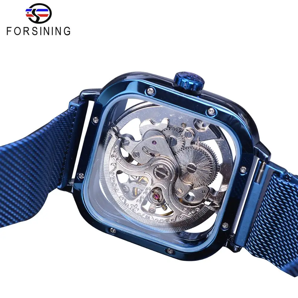 Product Name: Forsining niebieskie zegarki dla mężczyzn automatyczna mechaniczna moda sukienka kwadratowy szkielet Wrist Watch slim, z siatką pasek stalowy zegar analogowy