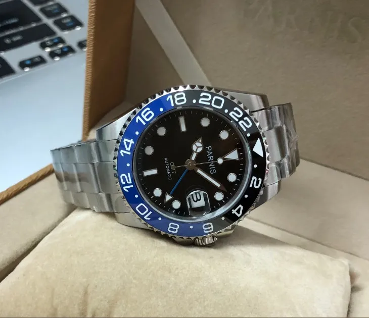 Product Name: 40mm PARNIS szafirowe GMT automatyczne maszyny ruch luminous zegarki męskie czarny i niebieski ceramiczna ramka szkiełka zegarka xjp230A