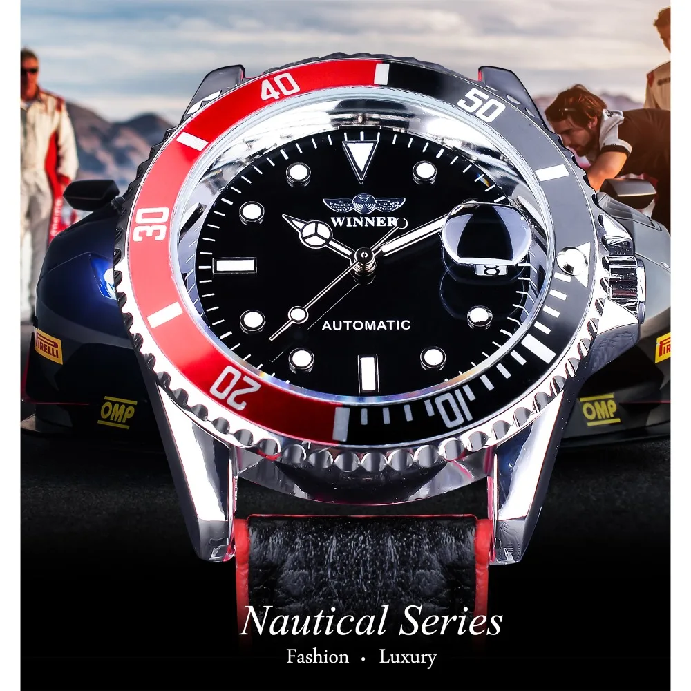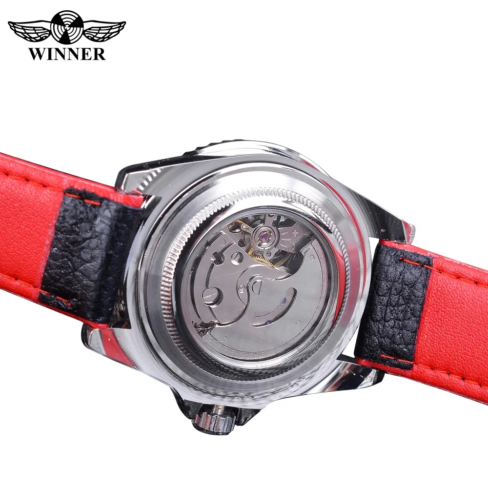 Special Offer Zwycięzca 2018 moda czarny czerwony Sport zegarki kalendarz wyświetlacz automatyczne self wiatr zegarki dla mężczyzn świetliste dłonie prawdziwy skórzany Discount 0% Today!