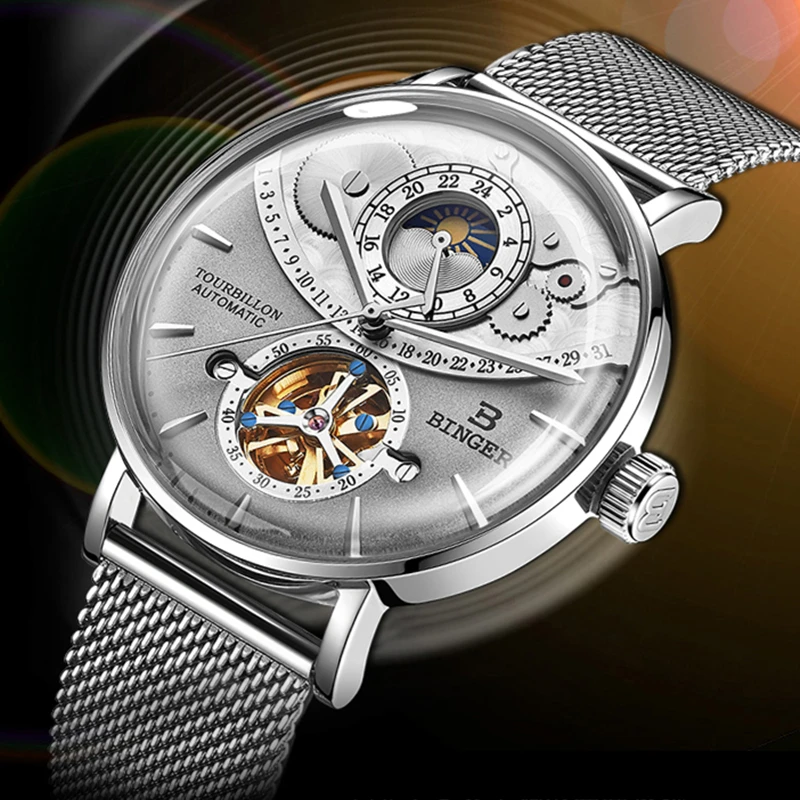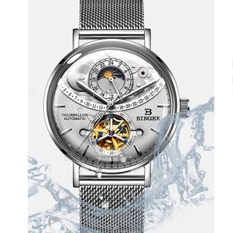 Product Name: BINGER szkielet mechaniczne zegarki męskie faza księżyca szwajcaria automatyczny zegarek mężczyźni pełna stal Relogio Masculino wodoodporne zegary