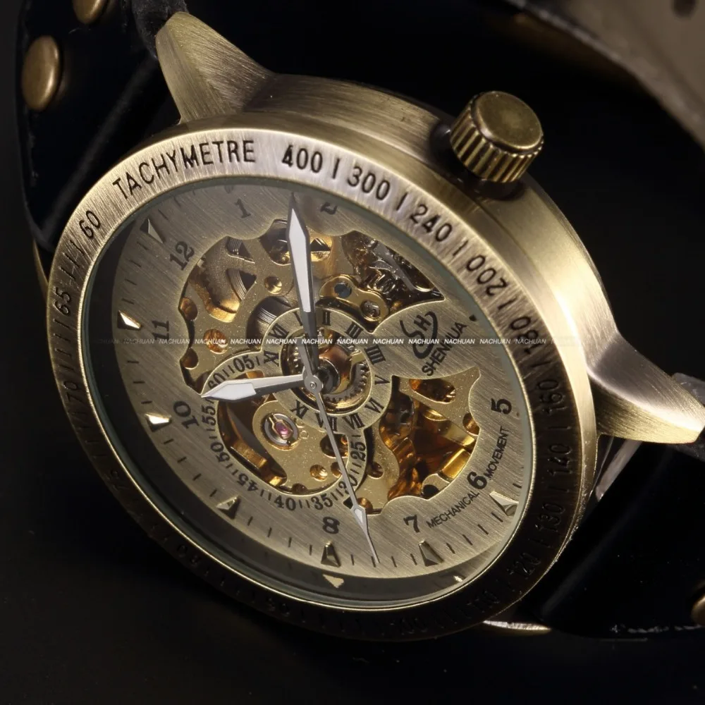 Special Offer Shenhua marka z brązu w stylu Vintage automatyczne szkielet zegarki mechaniczne mężczyźni analogowy skórzany zegarek na rękę zegarek na co dzień erkek kol saati Discount 50% Today!