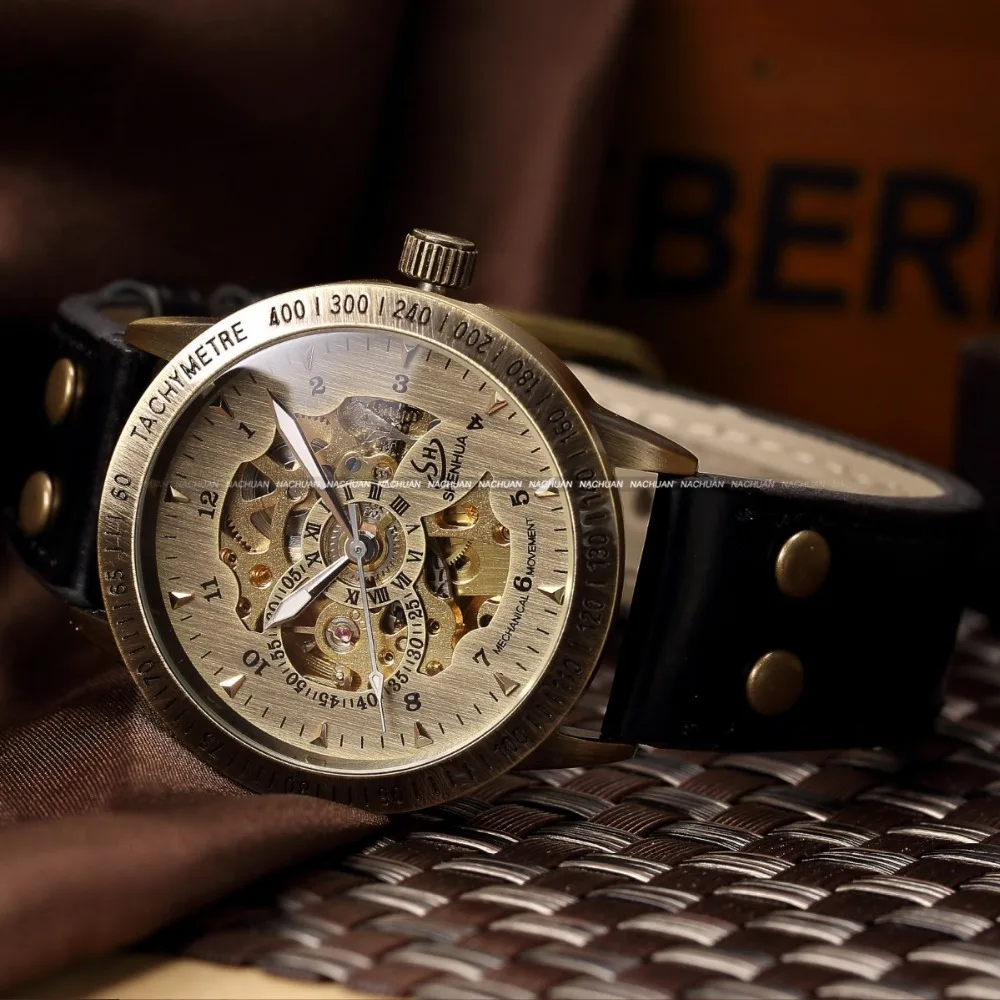 Product Name: Shenhua marka z brązu w stylu Vintage automatyczne szkielet zegarki mechaniczne mężczyźni analogowy skórzany zegarek na rękę zegarek na co dzień erkek kol saati