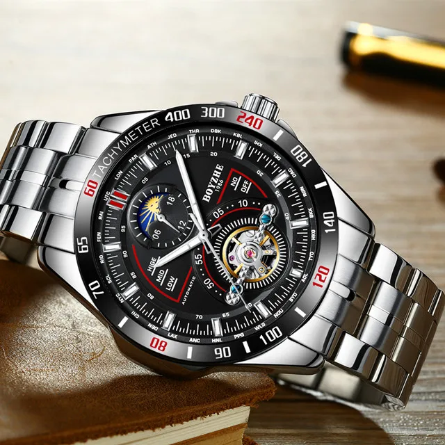 Special Offer BOYZHE mężczyźni automatyczne mechaniczne WatchTourbillon fazy księżyca mody luksusowe biznes pasek ze stali nierdzewnej zegarek sportowy Discount 50% Today!