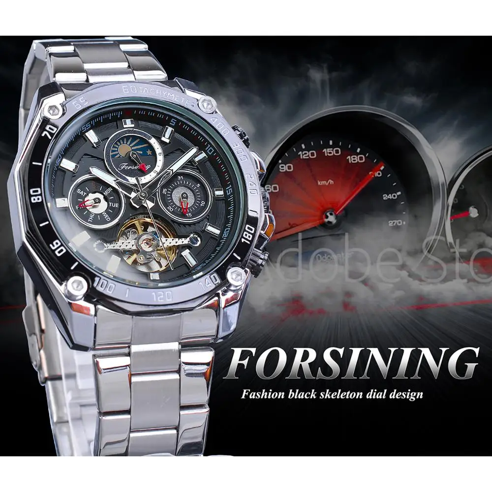 Special Offer Forsining marka czarne męskie mechaniczne zegarki automatyczne wielofunkcyjne Tourbillon faza księżyca data sporty wyścigowe pasek stalowy Relogio Discount 15% Today!
