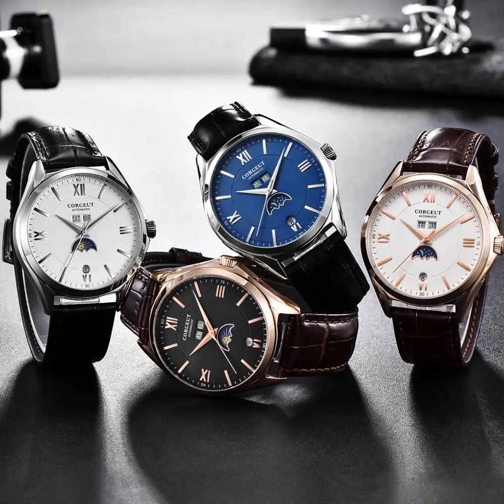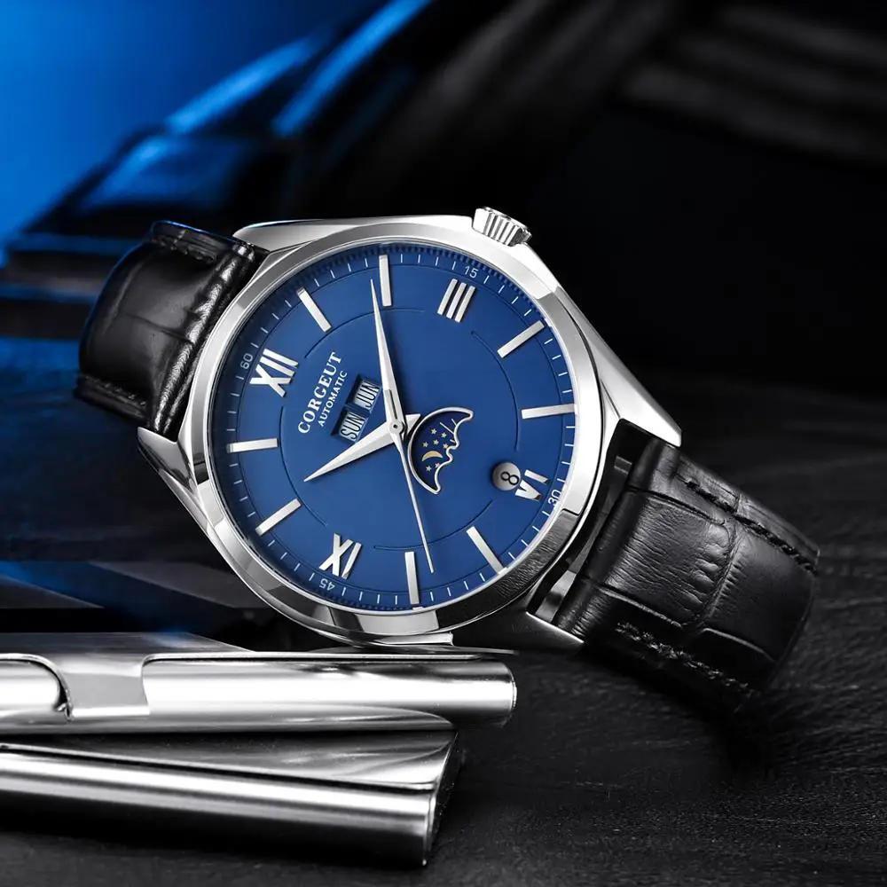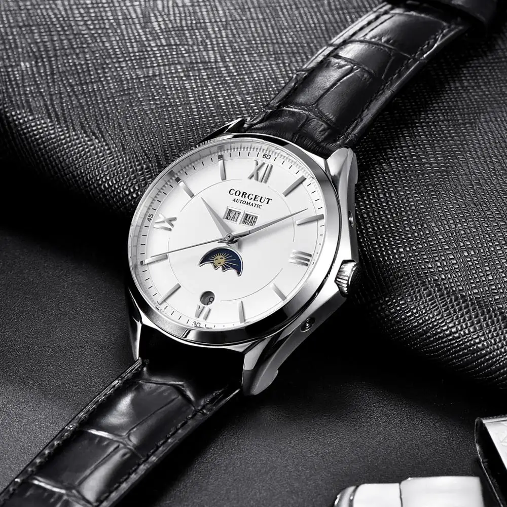 Special Offer Top marka 41mm Corgeut biały niebieski czarny dial SS rosegold case data tydzień faza księżyca zegar leatcher automatyczny mechaniczny zegarek męski Discount 38% Today!