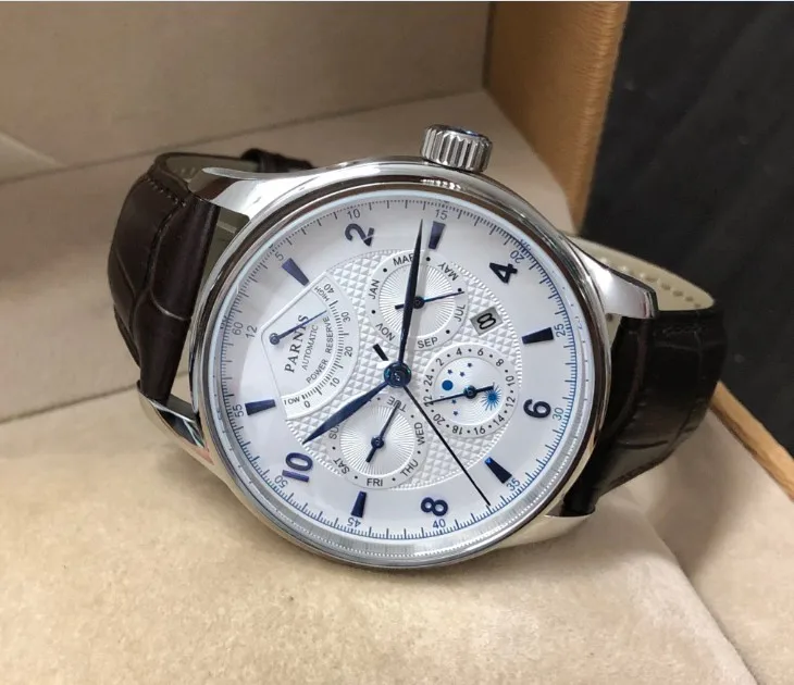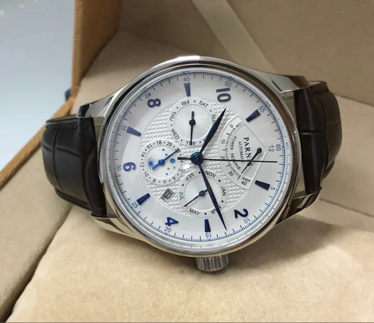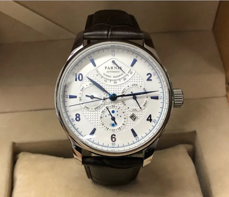 Product Name: 42MM PARNIS 26 klejnotów japoński 9100 automatyczne self wiatr mechaniczne zegarki biała tarcza szafirowe mężczyzna zegarka 207