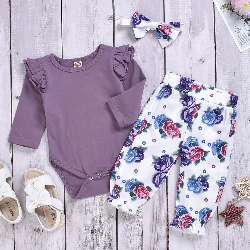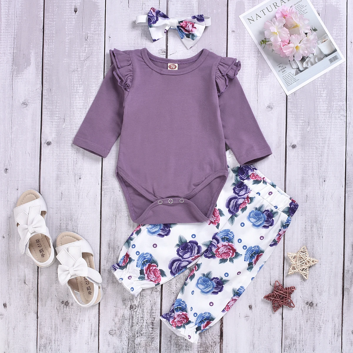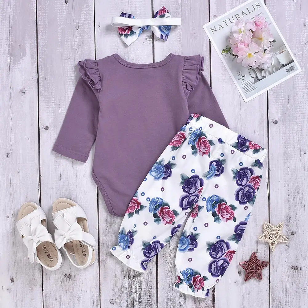 Special Offer Maluch dziewczyna tkaniny 3 sztuk śliczne fioletowe długie rękawy Tee koszula spodnie noworodka ubrania garnitur zestaw dziecięcy z kombinezonem pałąk Discount 0% Today!