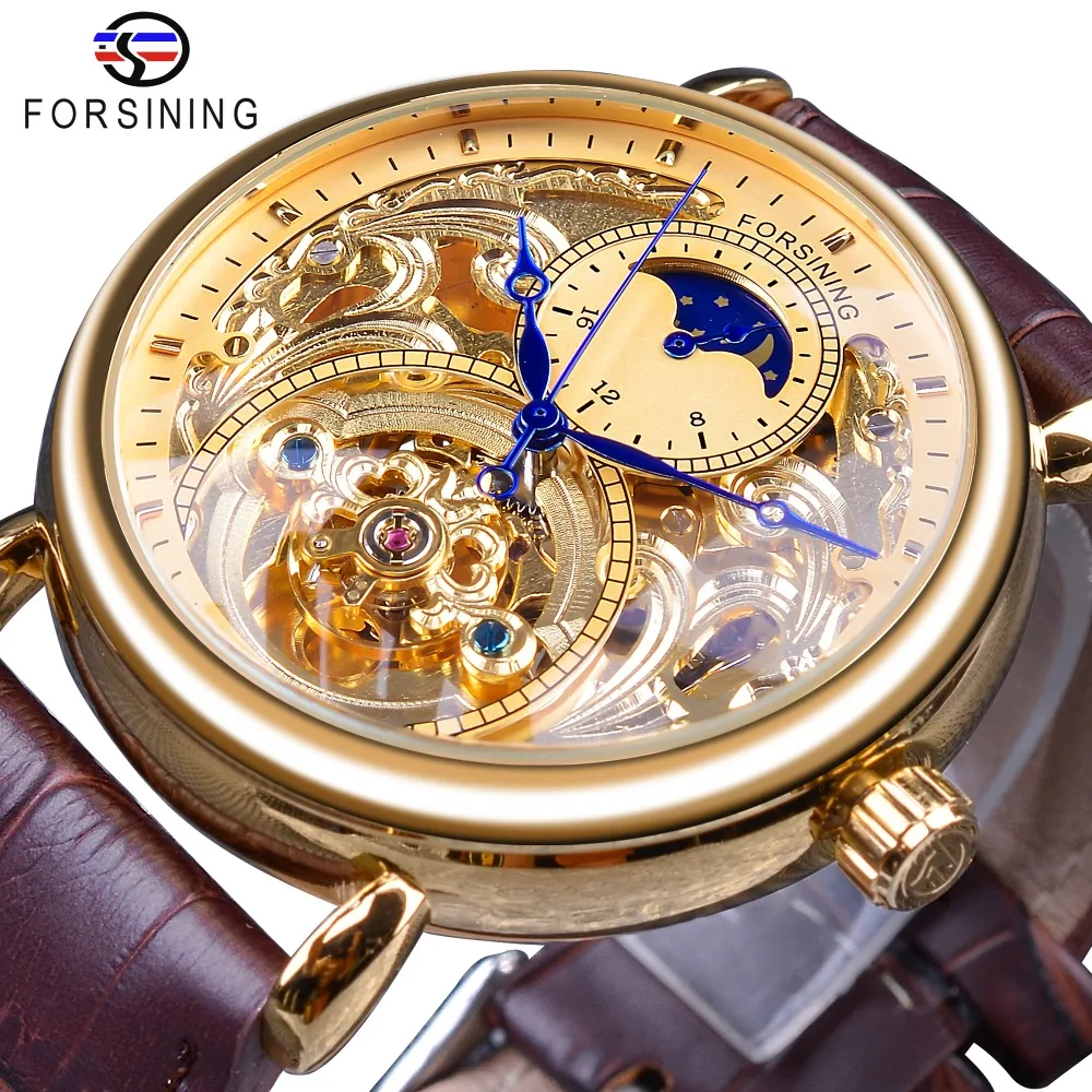 Product Name: Forsining 2018 królewski złoty szkieletowy wyświetlacz niebieskie dłonie brązowa prawdziwa skóra pas mężczyzna mechaniczne zegarki na rękę zegar mężczyzna