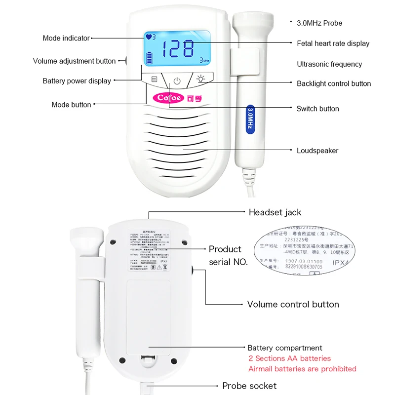 Product Name: Cofoe płodowy usg metodą dopplera Baby Heartbeat Detector i bezdotykowy cyfrowy termometr na podczerwień odpowiedni dla całej rodziny