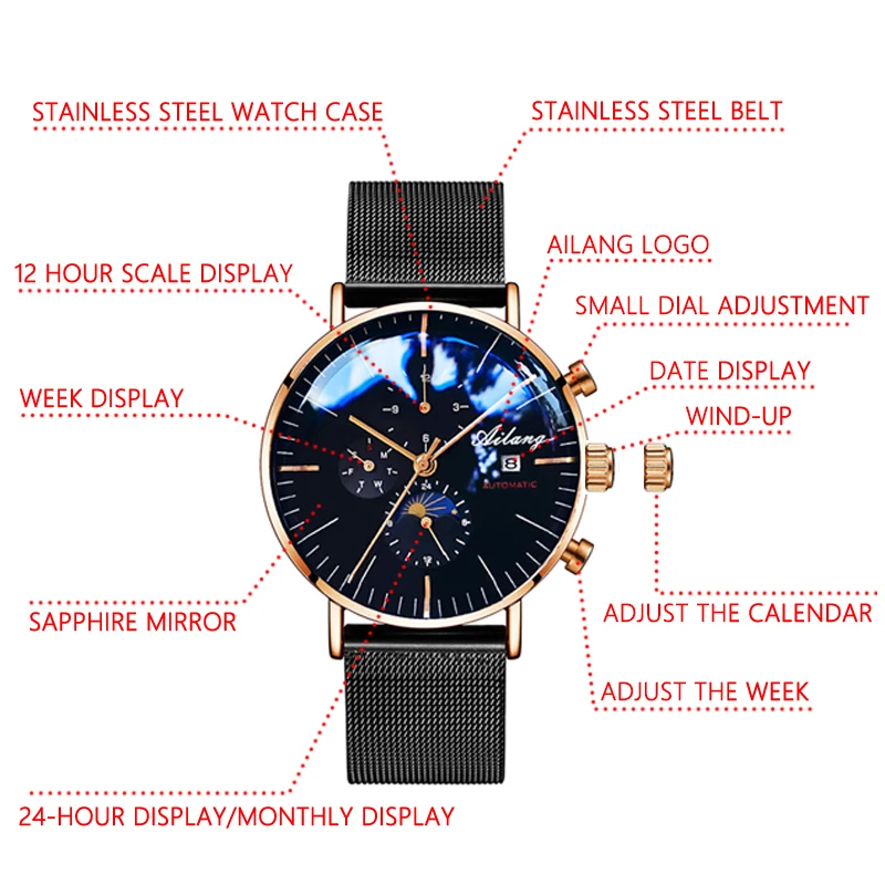 Product Name: AILANG męska mechaniczne automatyczne moda Top marka Sport Watch Tourbillon Moon Phase zegarek ze stali nierdzewnej mężczyzna zegar