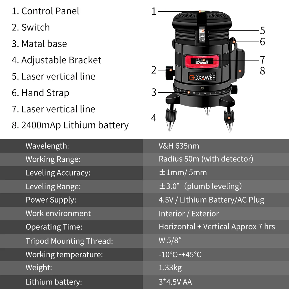 Product Name: GOXAWEE 5 linie 6 punktów poziom lasera 360 automatyczne samopoziomujący pionowy i poziomy obrotowy laser liniowy krzyżowy narzędzie pomiarowe