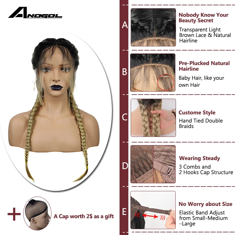 Product Name: Anogol wstępnie oskubane długi podwójny warkocze czarny brązowy ciemne korzenie Ombre blond syntetyczny pleciony koronkowa peruka na przód z dzieckiem włosy