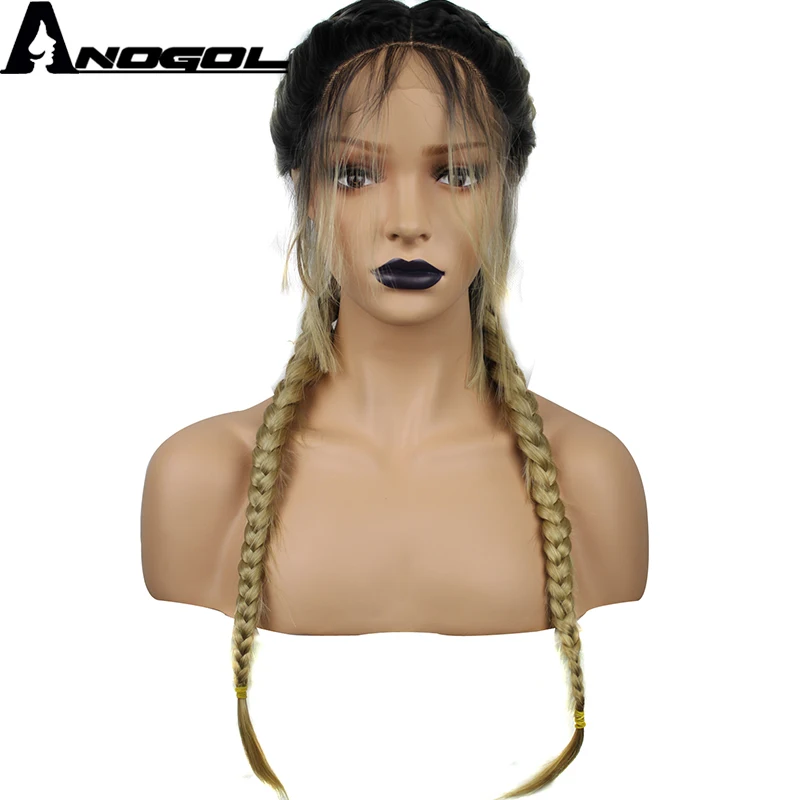 Special Offer Anogol wstępnie oskubane długi podwójny warkocze czarny brązowy ciemne korzenie Ombre blond syntetyczny pleciony koronkowa peruka na przód z dzieckiem włosy Discount 31% Today!