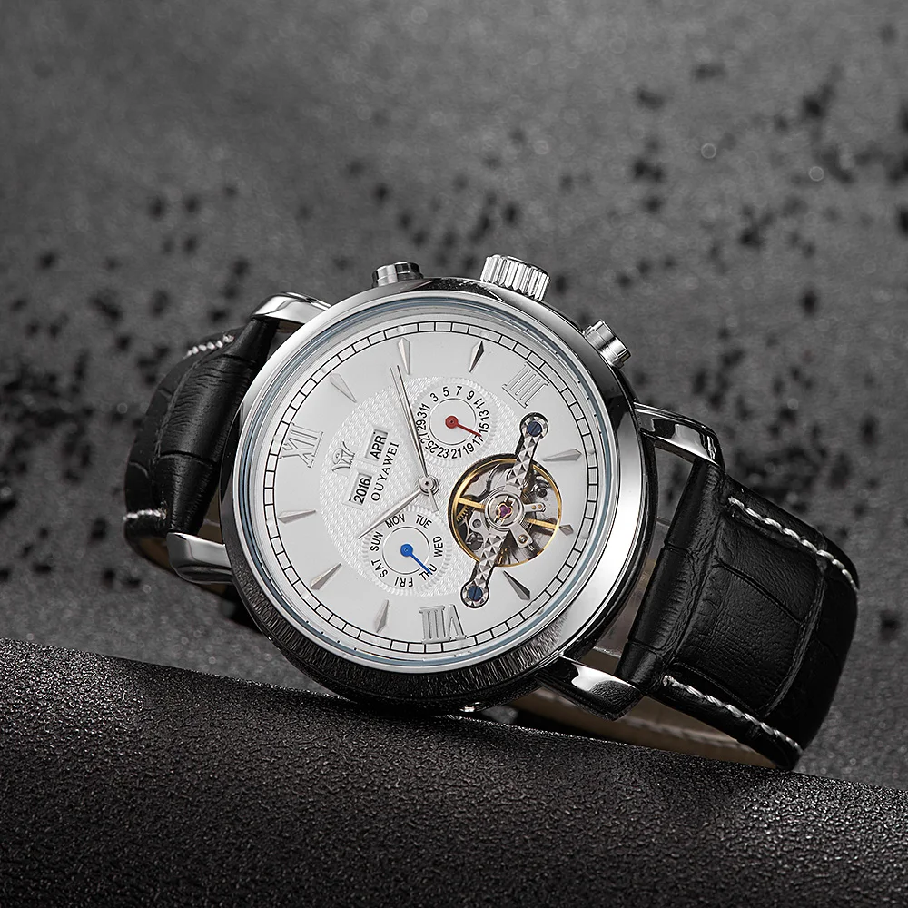 Product Name: OUYAWEI męskie zegarki Top marka luksusowe pełna kalendarz koło zamachowe Dial automatyczny mechaniczny zegarek na rękę skórzany pasek Armbanduhr