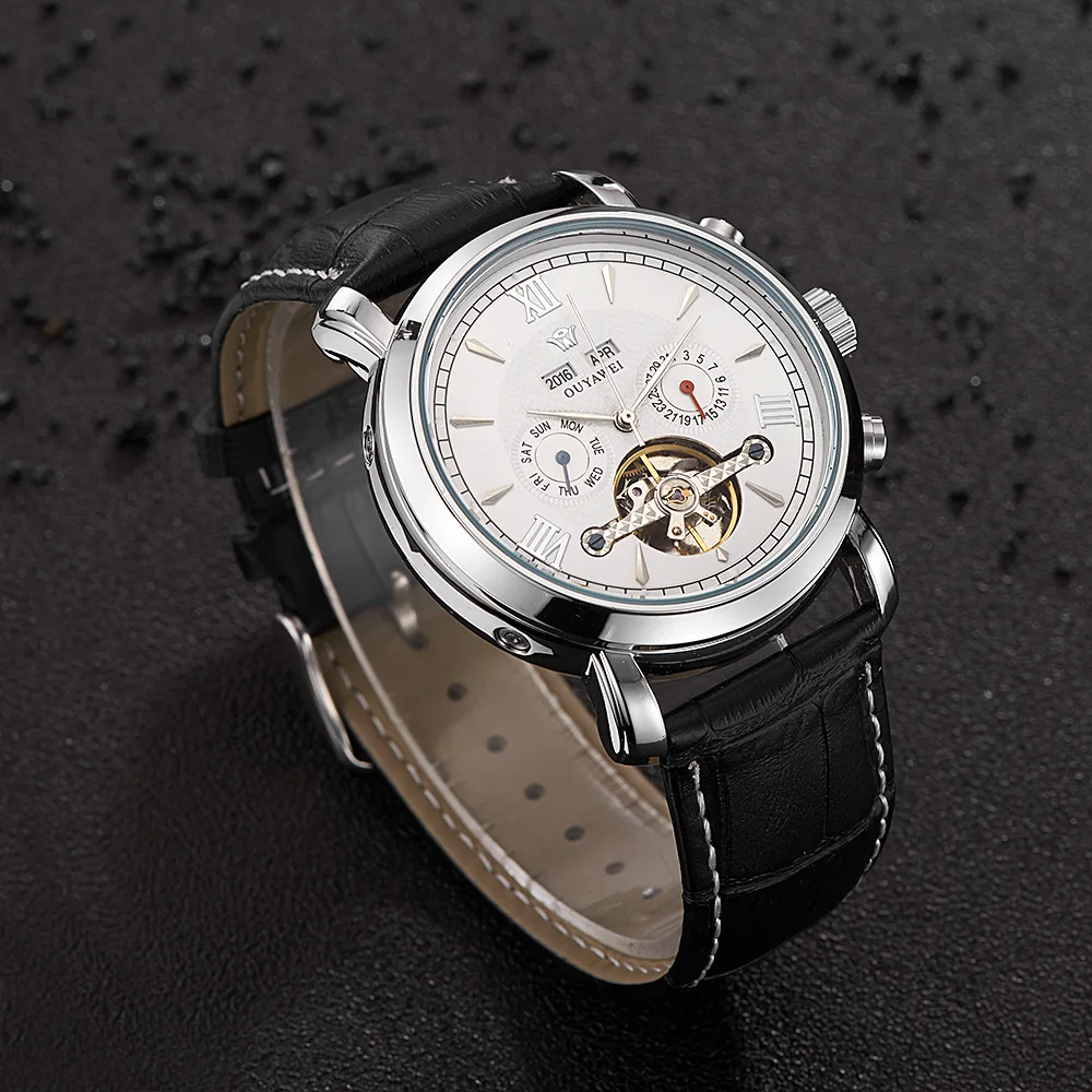 Special Offer OUYAWEI męskie zegarki Top marka luksusowe pełna kalendarz koło zamachowe Dial automatyczny mechaniczny zegarek na rękę skórzany pasek Armbanduhr Discount 32% Today!